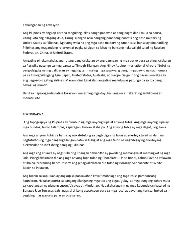 Lokasyon ng pilipinas kahalagahan. Kahalagahan ng lokasyon ng pilipinas. Maaaring maging sentro ito ng pamamahagi ng ibat ibang produkto at kalakaln mula sa ibang bansa ng Timog-Silangang Asya. ANG TERITORYO NG PILIPINAS Kasunduan sa Paris - Inilipat ng Espanya sa Amerika ang pamamahala.